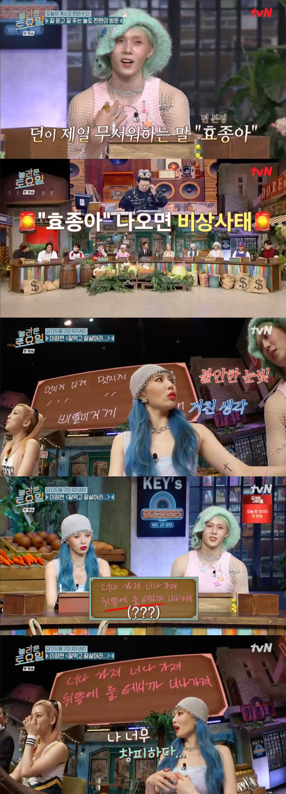 던은 이날 현아에 대해 당부하고 싶은 게 있냐는 질문에 "제가 제일 무서워하는 말이 '효종아'다. 현아가 이름을 부를 때. 혹시 오늘 효정이가 나오면 저희 둘(의 의견)은 하나라고 보시면 될 것 같다"고 말해 폭소를 안겼다. 붐은 "'효종아'라는 말이 나오면 비상사태인 거냐"고 물었고, 현아는 이에 던을 살짝 밀치며 던의 말이 진실임을 알렸다.