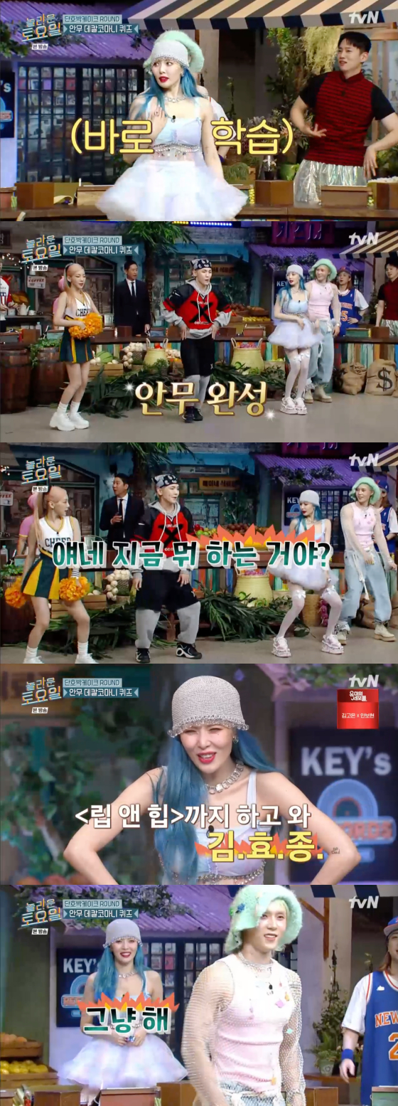 단호박 케이크가 걸린 간식 게임은 '안무 데칼코마니 퀴즈'였다. 같은 동작의 두 사진을 보고 두 곡의 제목을 맞추는 것이었다. 키는 레드벨벳의 '피카부'와 전소미의 '덤덤'으로 무대에 섰고, 두 곡 다 안무를 전부 다 외워 추며 충격을 자아냈다. 평소 '놀토'의 팬이라던 현아는 내내 환호하며 "어떻게 다 알지. 진짜 신기하다. 대박이다"라고 소리쳐 눈길을 모았다.