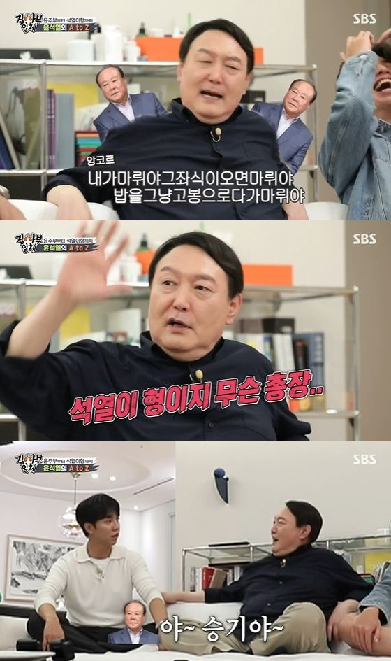 이날 윤석열은 "맛있는 거나 해주려고 불렀다"며 남다른 요리실력을 자랑하며 소탈한 모습을 보였다. 이에 이승기는 "TV에서 볼 때는 무서운 스타일인 줄 알았는데"라고 말했고, 윤석열은 "편하게 들어오라"고 화답했다.