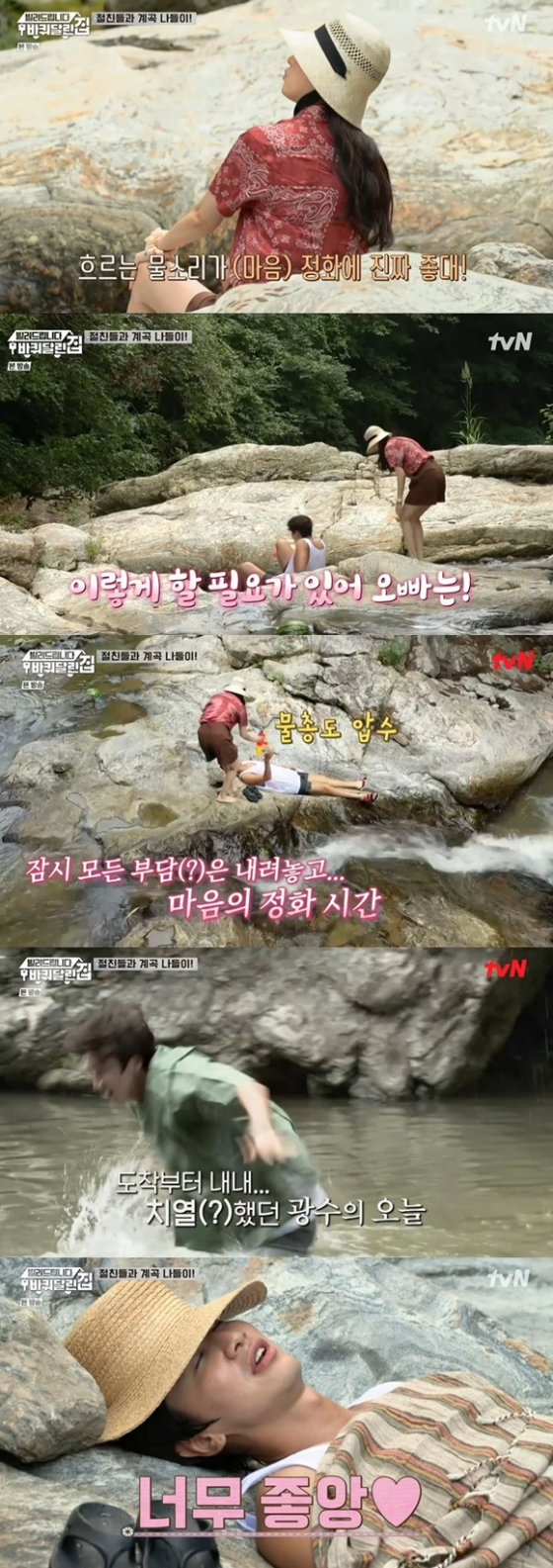 이날 계곡 바위에 누워있던 한효주는 이광수에게 "오빠도 여기 누워 봐. 이 흐르는 물 소리가 마음 정화에 진짜 좋대"라며 이광수의 물총을 빼앗았다.