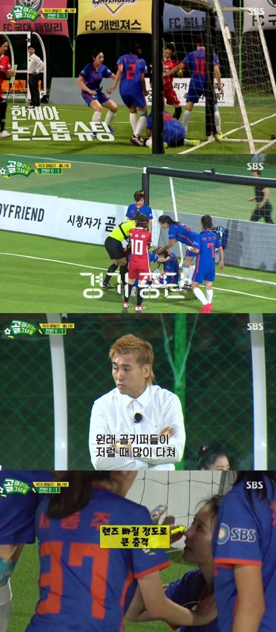 '골 때리는 그녀들'에서 한채아의 슈팅에 골키퍼 안혜경이 큰 부상을 당할 뻔 했다.