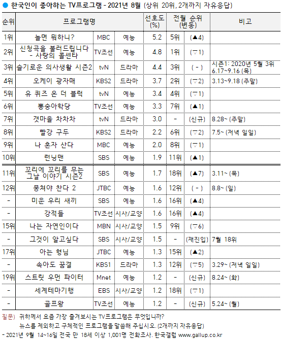 여론조사 전문회사 한국 갤럽은 지난 14일부터 16일까지 사흘간 전국 만 18세 이상 1001명을 대상으로 요즘 가장 즐겨보는 TV 프로그램을 물은 결과(2개까지 자유응답) 선호도 5.2%를 기록한 '놀면 뭐하니?'가 1위를 차지했다고 23일 밝혔다.