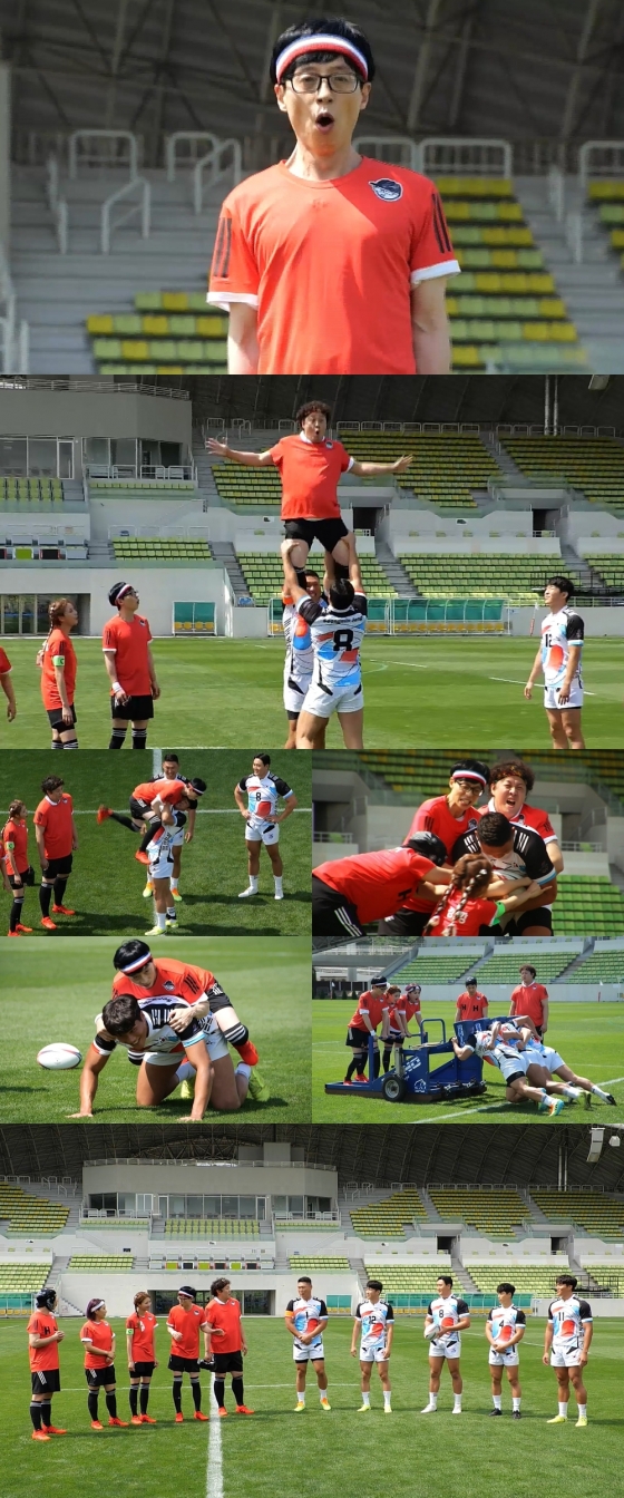 공개된 사진 속에는 럭비 국가대표 선수들의 손에 번쩍 들려 공중부양한 유재석과 정준하의 모습이 담겨있다. 럭비 국가대표 선수 2명이 정준하를 높이 들어 올린 모습에 모두가 입을 다물지 못했다고.