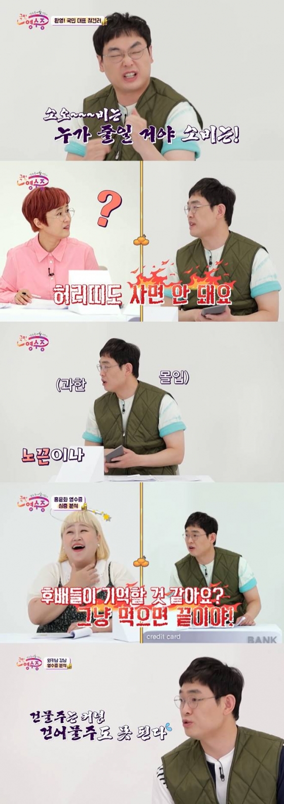 '국민 영수증'에서 박영진의 역할은 '프로 참견러'. 과거 '개그콘서트' 시절 '꼰대' 캐릭터로 "소는 누가 키워?"라고 했던 그가 '국민 영수증'에선 "소오~비는 누가 줄일 거야 소비는!"이라고 소리치며 시청자들에게 쓴소리 맴매를 든다.