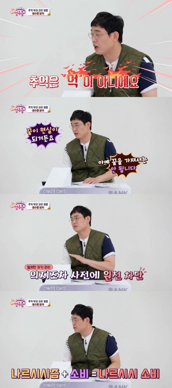 강남은 가랑비에 옷 젖듯 자잘한 소비를 주로 했다. 이에 박영진은 "돈을 이렇게 쓰다간 건물주가 아니라 건어물주도 안 된다"고 뼈가 담긴 말장난을 해 보는 이들을 웃프게 했다. 이날 추억 부자 자유 영혼의 시청자 의뢰인이 영화 '미나리'를 보고 미나리 삼겹살을 먹은 영수증을 공개했다. 박영진은 "'기생충' 보면 기생충 먹을 거야?"라고 소리쳤다. 또 나룻배를 타고 맛집에 찾아간 의뢰인에게 그는 "우리는 추억부자가 아니라 수억부자가 돼야 한다. 추억은 억이 아니다"라며 말해 모두를 끄덕이게 만들었다.