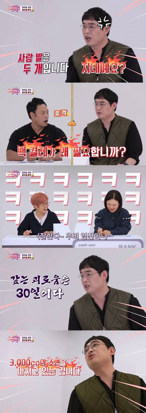 양치승은 헬스 트레이너의 또 다른 모습으로 자신의 가득찬 신발 컬렉션을 자랑했다. 이를 본 박영진은 "사람 발은 두 개입니다. 지네예요? 백 켤레가 왜 필요합니까?"라고 역정을 냈다. 신발과 함께 옷도 좋아하는 양치승에게 박영진은 "거의 벗고 있는데 옷은 왜 삽니까?"라고 일침하기도 했다. 양치승은 퇴근 후 매일 편의점 맥주를 2주에 60만원 가량 즐기는 일상을 공개하기도 했다. 박영진은 "모든 음식은 식도를 넘어가는 순간 배설물이다. 맥주는 식도를 넘어가는 순간 맛도 못 느끼고 바로 소변이다. 양치승 씨는 퇴근 후 3000cc의 소변을 드시고 있는 겁니다"라고 과학적 접근의 역정을 냈다.