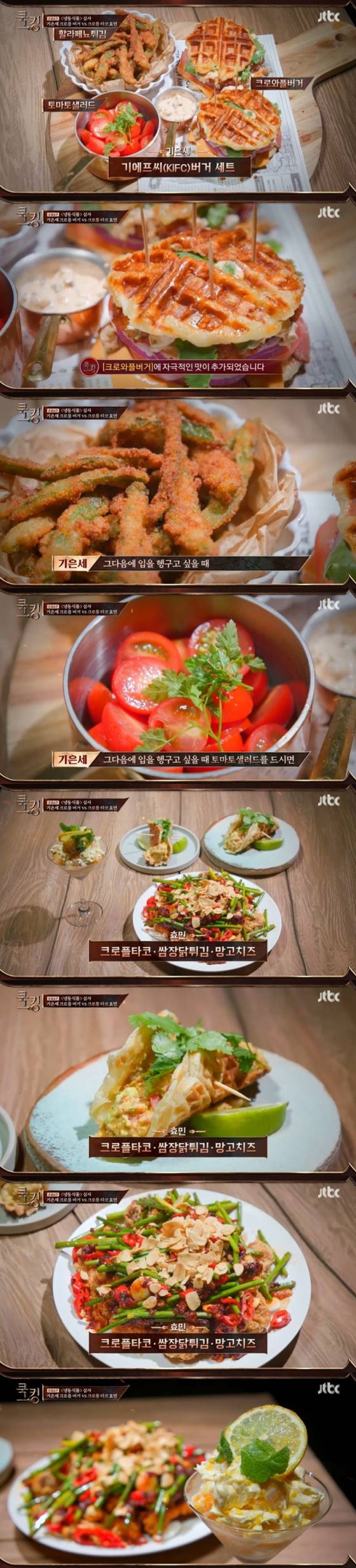기은세는 크로와플 버거 'KiFC'와 할라피뇨 튀김, 토마토 샐러드를, 효민은 크로플 타코와 쌈장닭튀김, 망고치즈를 대결 요리로 선보였다.