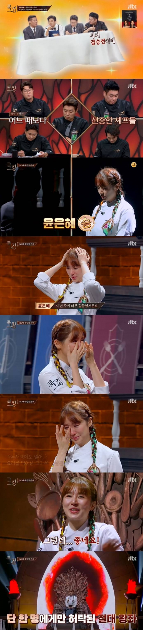 기은세는 승리 소감으로 "셰프님들이 평가를 말하실 때 울컥했다. 남은 왕좌까지 열심히 하겠다"고 말했다. 효민은 "'쿡킹'을 준비할 때 진짜 많이 배웠다. 열정이 다시 올라오는 것 같았다. 요즘 뭘 해도 열정이 없는 느낌이었는데 진짜 재미있다는 생각을 오랜만에 해봤다"며 눈물을 보였다.