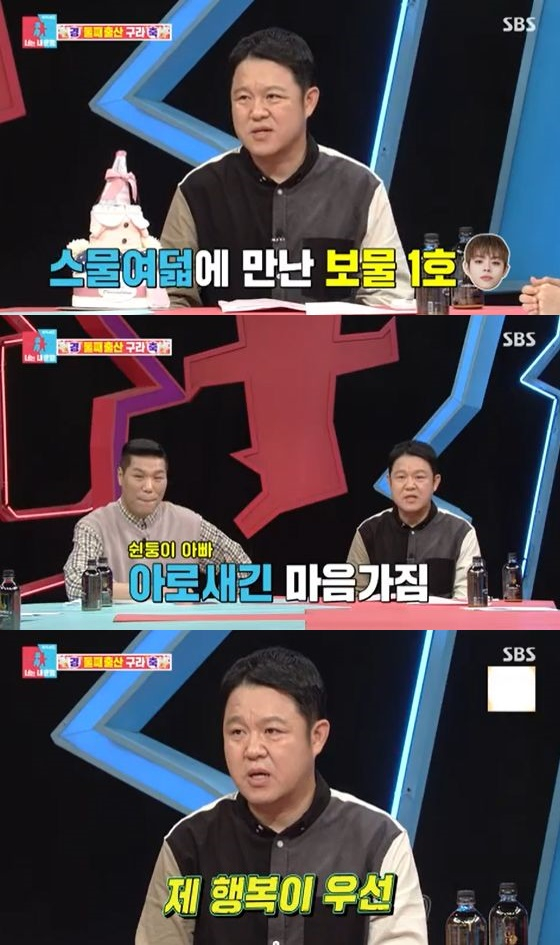 이에 MC 서장훈은 "이제 더욱더 어깨가 무거워지셨겠다"고 김구라에게 물었다. 김구라는 "많은 분들의 축하문자를 받았다. 답장을 '내가 즐거워야 아이도 즐겁다'라고 보낸다. 제 행복이 우선이니 아이에게 올인하고 하지 않겠다. 아이에게 일방적 희생할 생각이 추호도 없다"라고 밝혀 웃음을 자아냈다.