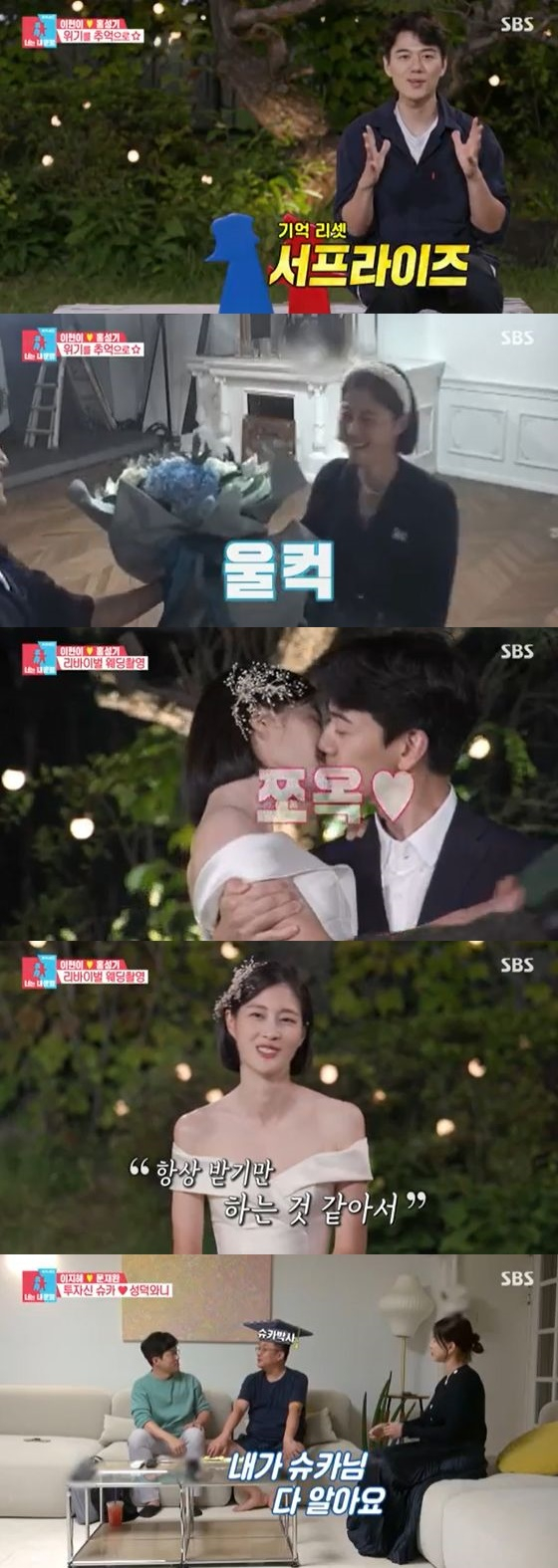 이어 부부의 리마인드 웨딩투어가 이어졌다. 홍성기는 "그때 나빴던 감정들이 떠오를 거다. 이벤트를 통해 안좋았던 감정들을 다 씻어낼 수 있는 시간을 준비했다"며 몰래 준비한 깜짝 이벤트를 선보였다. 홍성기는 손 편지를 읽어주며 "사이 좋게 지내자 사랑해"라고 말했다. 이현이는 감동을 받고 눈시울을 붉혔다.