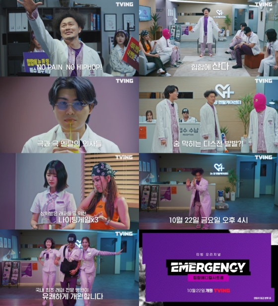 14일 티빙 오리지널 '힙합 메디컬 시트콤 - EMERGENCY'(이하 '이머전시')가 캐릭터 티저 영상 3종 세트를 공개하며 힙합계의 새 바람을 예고하고 있다.