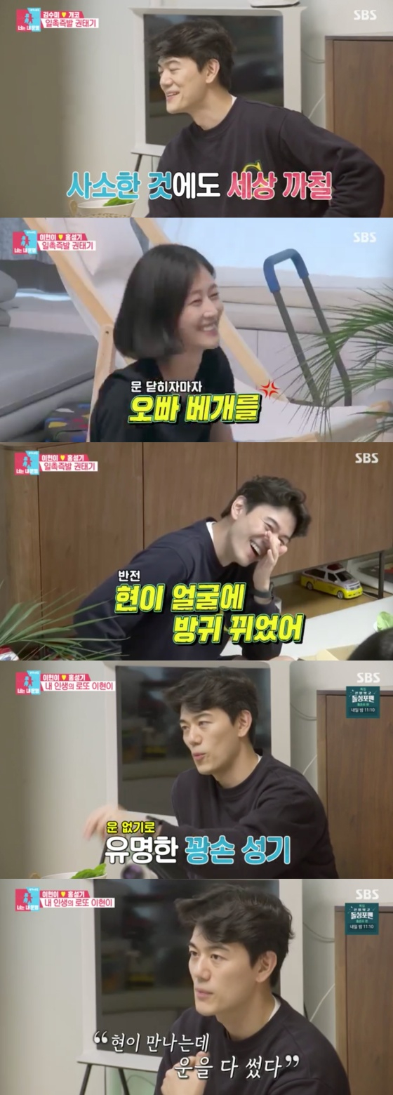 이현이 역시 "홍성기가 출근 할 때 깨고도 자는 척했다. 홍성기가 집에서 나가면 홍성기 베개를"이라며 때리는 행동을 했다. 이에 홍성기는 "자는 이현이 얼굴에 방구 뀌었다"고 한 술 더 떴다.