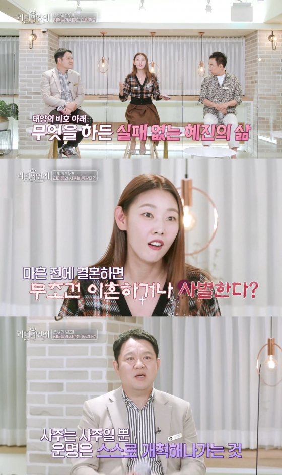 그러면서 한혜진은 "내 사주는 태양이 떠받치는 사주라 뭘 하든 실패가 없다더라 그런데 문제가 하나 있다. 마흔 전에 결혼하면 무조건 이혼하거나 사별한다더라"라고 전하며 황당한 표정을 지었다.