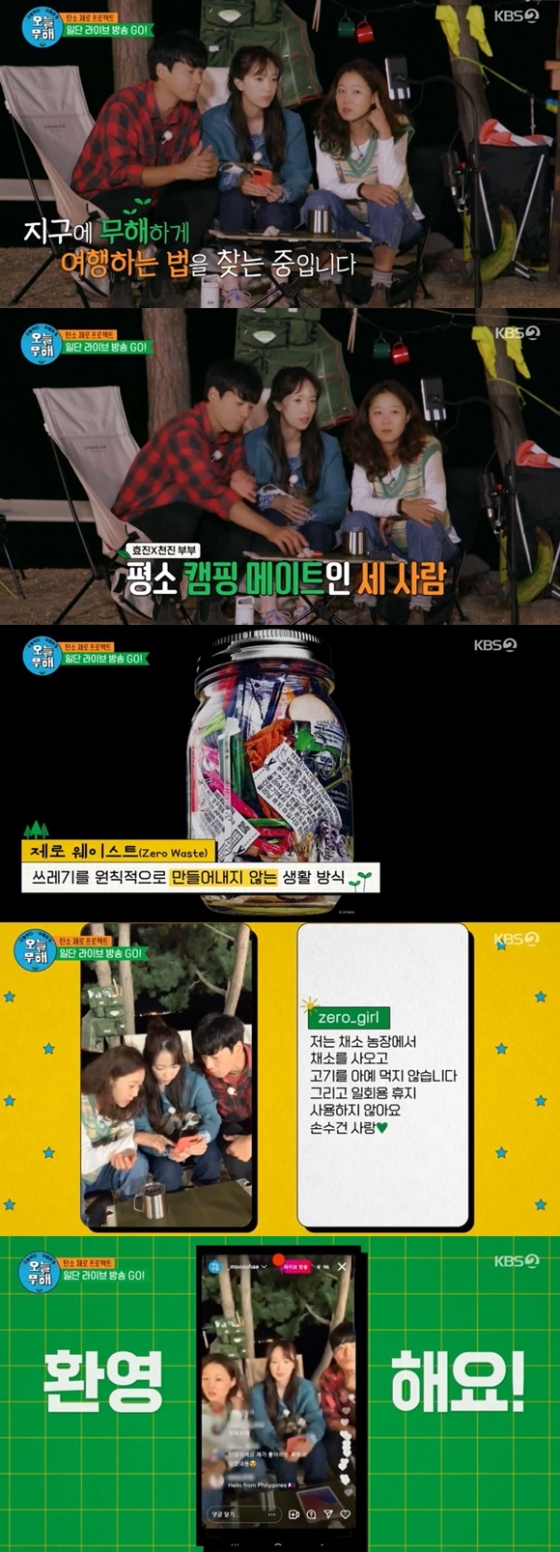 공효진은 "무해가 뭘까요"라며 원론적인 질문을 던지기도 했고 "여기서 지구에 무해하게 여행하는 방법을 찾아보려고 왔어요"라며 숲속에서 캠핑을 하는 이유를 밝히기도 했다.