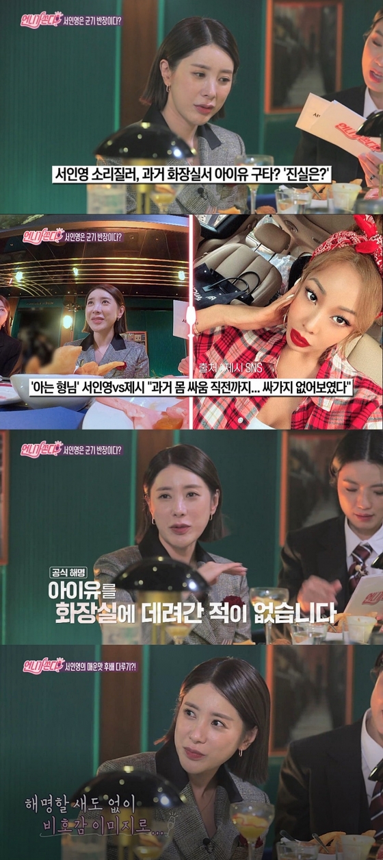 먼저 서인영은 '아이유를 화장실로 데려가서 구타했다'라는 루머에 대해 "때리고 싶으면 대기실에서 때리지 왜 화장실로 끌고 가겠는가? 아이유 씨를 화장실에 데려간 적도, 구타한 적도 없다. 아이유 씨가 '그런 일이 없다'라고 해명을 해주신 적도 있다"며 거짓임을 밝혔다.