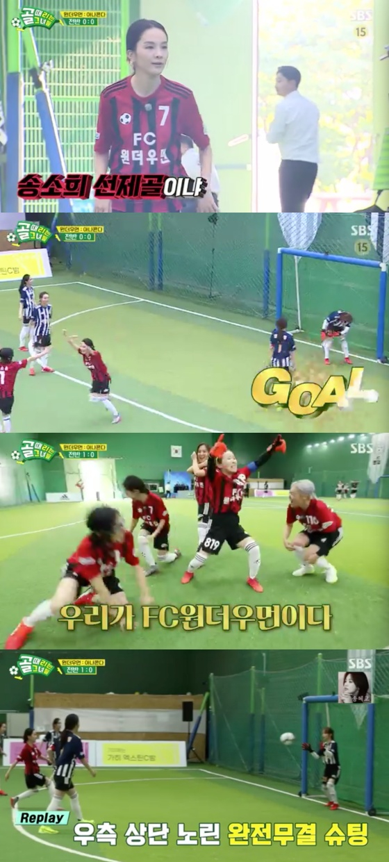 국악소리가 송소희가 '골 때리는 그녀들'에서 첫골을 넣으며 FC원더우먼이 앞서나갔다.