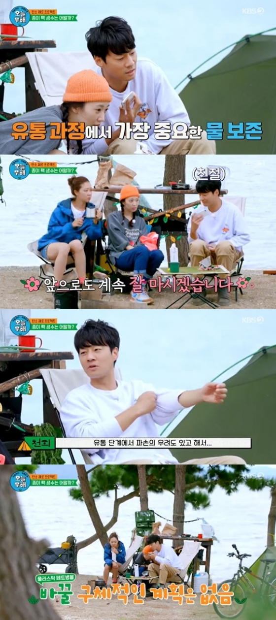 이천희는 "물이 플라스틱 생수병에 들어있지 않나. 다른 대체될 수 있는 재질이 없을까"라고 물었다. 생수업체는 "플라스틱의 경량화라던가 생각하고 있는데 종이팩 변경은 계획이 없다. 유통 과정 중 물이 변질될 수 있어서"라며 플라스틱을 쓸 수밖에 없는 이유를 밝혔다.