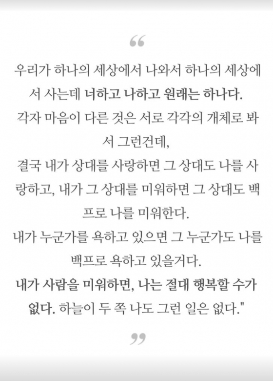 글귀에는 특히 "내가 누군가를 욕하고 있으면 그 누군가도 나를 백프로 욕하고 있을 거다. 내가 사람을 미워하면 나는 절대 행복할 수가 없다. 하늘이 두쪽 나도 그런 일은 없다"는 구절이 네티즌들로부터 시선을 모으고 있다.