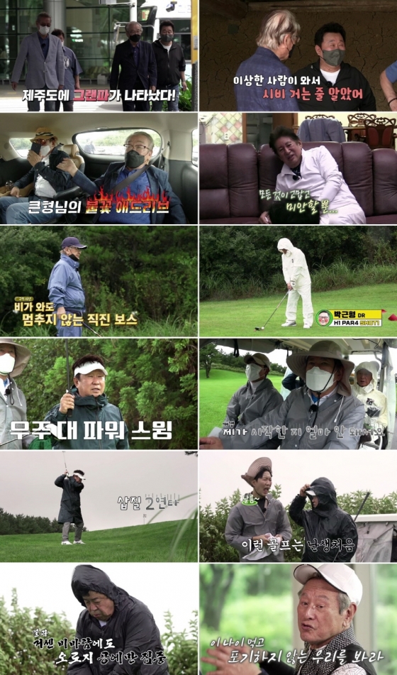 점점 거세지는 비바람 속에서도 '그랜파' 4인방은 열정과 투혼을 발휘했다. 어처구니없는 기상 상황에 임하룡은 "이런 골프는 생전 처음이다, 평생 기억에 남을 것"이라며 헛웃음을 터트렸다. 결국 카메라마저 요동치는 악천후에 촬영이 중단됐고 재정비를 위해 그늘집으로 대피한 멤버들은 양말에서 물을 짜면서도 웃음을 잃지 않았다.