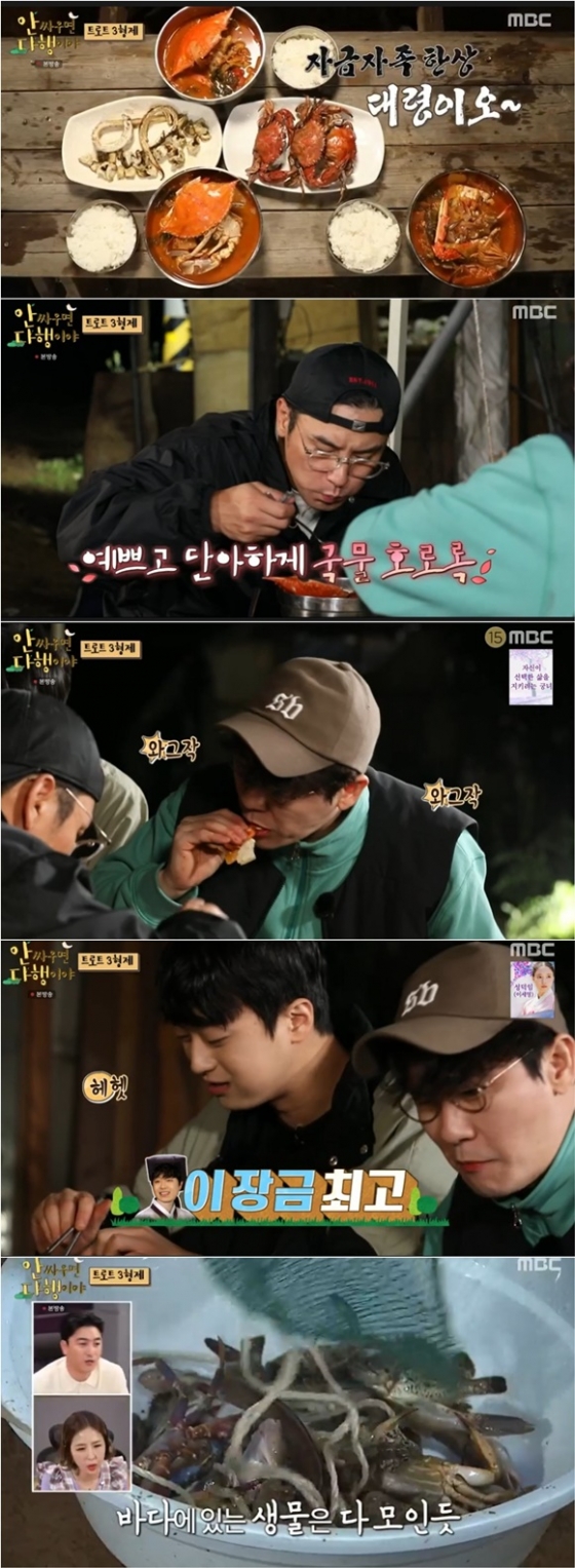 '안싸우면 다행이야'에서 이찬원의 요리로 영탁과 장민호, 이찬원이 외딴 섬에서 꽃게 파티를 벌였다.
