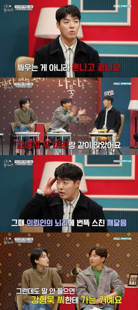 그는 "최근에 다툼이 있을 것 같아서 머리를 좀 식히고 오려고 일어섰는데 (이상화가) '앉아!'라고 하더라. (내가) 강아지 두 마리랑 같이 앉았다. 그때 내 뇌에서 '지고 살아야 한다. 그래야 행복이다. 말 잘 듣자 강남아'라고 생각했다"고 말했다.