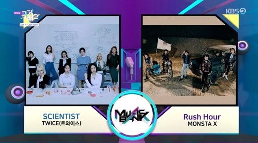 26일 방송된 KBS 2TV '뮤직뱅크'에서는 트와이스의 'Scientist'와 몬스타엑스의 'Rush Hour'가 1위 후보로 올랐다.