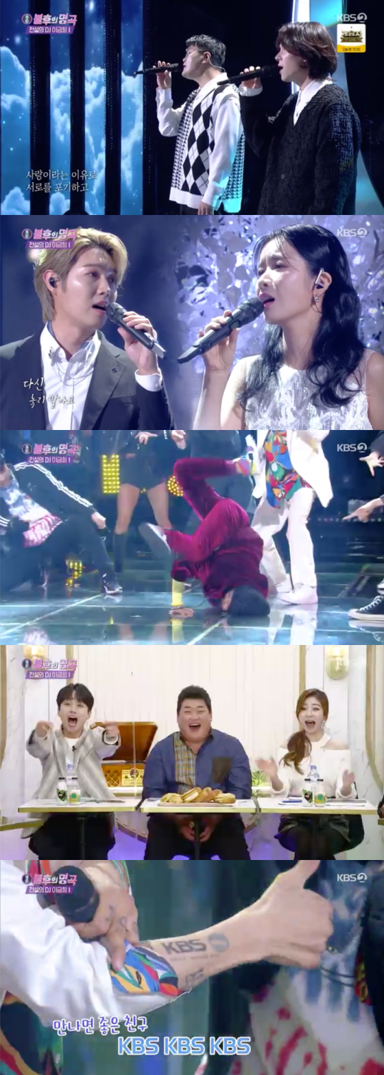 박애리와 팝핀현준 부부는 이어 나미의 '영원한 친구'로 무대에 올랐다. 매번 한복과 쪽진 머리로 출연했던 박애리는 이날 처음으로 다른 복장으로 등장해 눈길을 모았다. 무대서 비니와 형광 티셔츠를 입고 비걸로 변신한 박애리는 고난이도 브레이킹 동작까지 선보여 환호를 자아냈다. 두 사람은 무대 중간 "만나면 좋은 친구 KBS"라는 깨알 퍼포먼스로 웃음까지 더해 우승석 탈환에 성공했다.