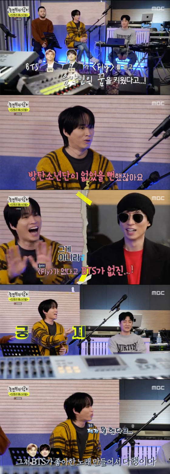 유재석은 이어 "BTS RM과 슈가가 'Fly'를 듣고 가수의 꿈을 키웠다"며 에픽하이를 칭찬했다. 타블로는 이에 "Fly를 만들기 참 잘했다는 생각이 들었다. BTS가 없을 뻔했지 않냐"고 답해 현장을 술렁이게 했다. 타블로는 "Fly를 듣고 가수의 꿈을 키웠다고 하니까"라며 변명을 해 웃음을 더했다.