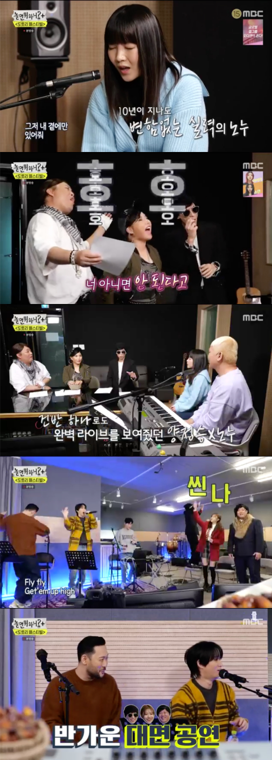 유재석은 당시 원곡자들이 방송 활동이 없었음을 주목하며 "KCM 씨랑 같이 불러본 적 없냐"고 물었고, 노누는 "KCM 씨 본 적도 없다"며 놀라움을 자아냈다. 이에 유재석은 즉석에서 두 사람의 라이브를 청했고, 양정승의 권유에 마이크를 잡고 KCM 파트를 소화해냈다. 현장은 녹슬지 않은 노누의 보컬과 아름다운 선율에 감격을 표했다.