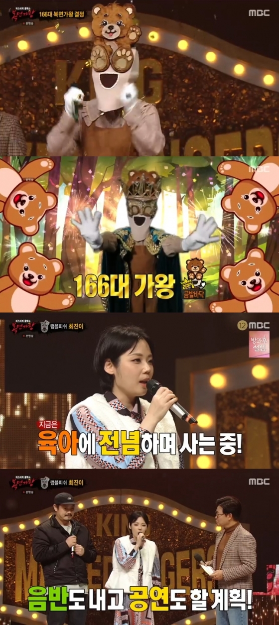 판정단 역시 쉽게 승부를 예측하지 못한 가운데 곰발바닥이 16대 5의 스코어로 승리하며 4연승으로 166대 가왕에 등극했다. 아쉽게 탈락한 장롱면허의 정체는 럼블피쉬의 보컬 최진이였다.