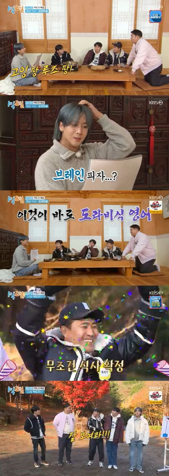점심 메뉴를 획득한 멤버는 라비와 딘딘이었다. 라비는 오리전골 한접시를 내걸며 영어퀴즈를 제안했다. 라비는 '갈팡질팡'을 "고잉 팡 루즈 팡"으로, '방귀 뀐 놈이 성낸다'를 "뿡가이 배드가이"라고 설명하며 현장을 웃음바다로 만들었다.