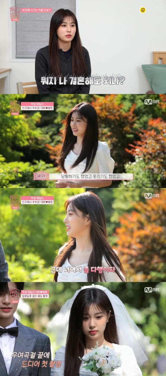 한 식구가 된 강혜원과 이대휘는 흩날리는 꽃잎을 배경으로 싱그러운 미소를 지어 아름다운 셀프 웨딩 사진을 완성했다.