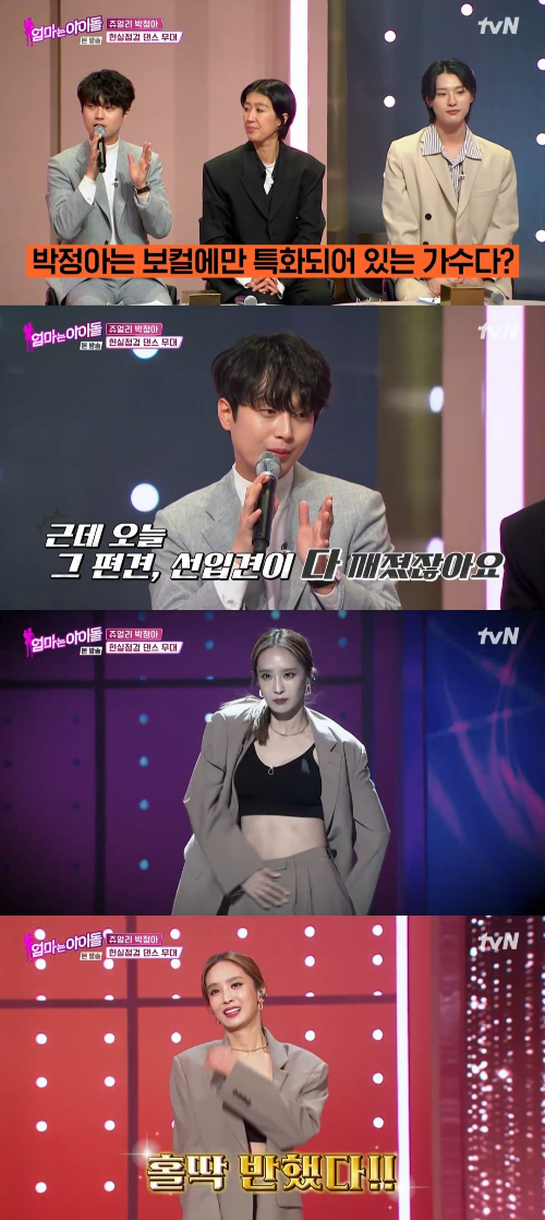 이찬원은 "'박정아는 보컬에만 특화되어 있는 가수다'라고 생각했는데 오늘 선입견이 다 깨졌다"면서 "눈빛으로 제압한 무대에 홀딱 반했다"고 극찬했다.