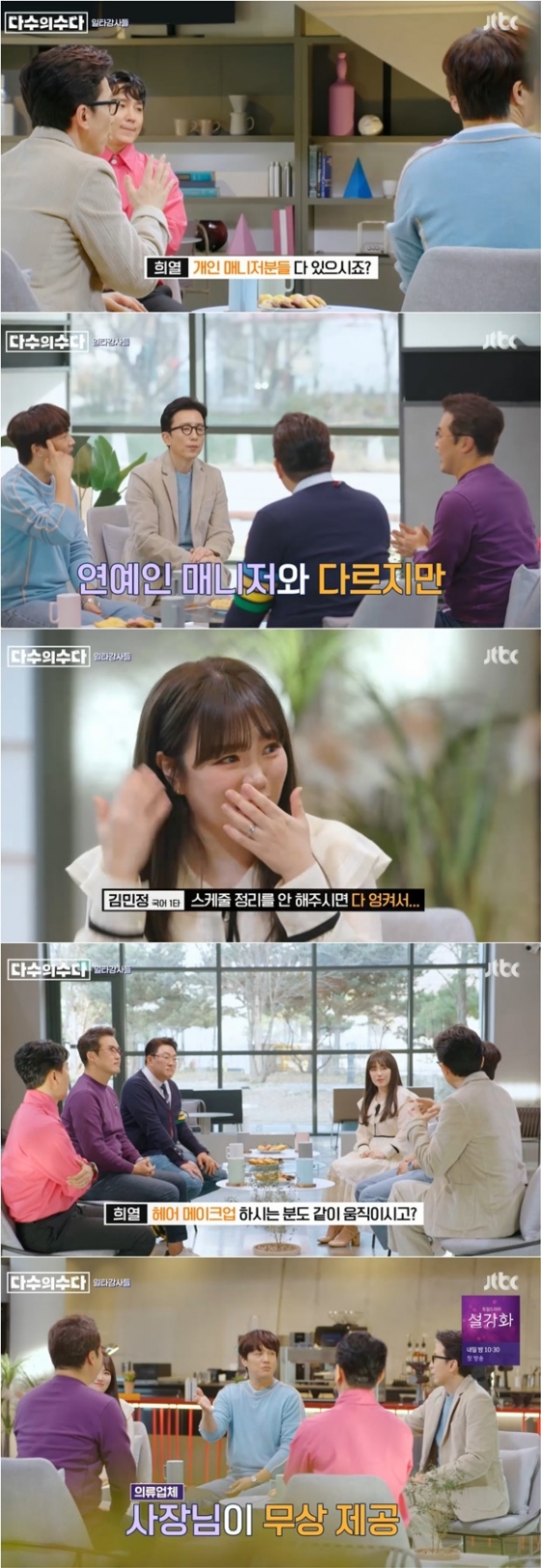 이날 방송에서 MC유희열은 "다 개인 매니저가 있지 않나"라고물었다. 이에 국어 일타강사 김민정은 "연예인 매니저와 다르지만 스케줄 관리해 주시는 분이 있다"고 답했다.