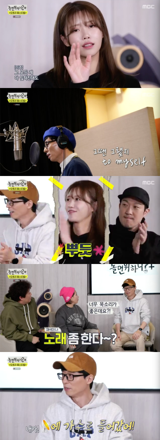 하하는 "늘었다"며 이를 인정했다. 정준하는 이어 "너 보컬 트레이닝 받냐"고 물었고, 유재석은 "안 받았는데. 놀면 뭐하니 하면서 여러 선생님들한테 레슨을 받은 거 같다. 켜켜이 쌓였다"고 답했다. 유재석은 이어 그래서 안테나 들어갔냐는 정준하에 "내가 안테나에 가수로 들어갔다"고 답해 폭소를 자아냈다.
