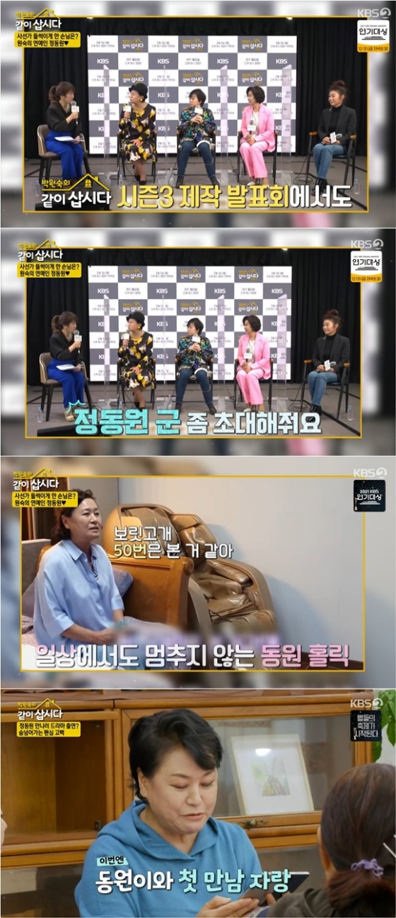 박원숙의 '박원숙의 같이 삽시다 시즌3' 제작 발표회에서도 "정동원 군 초대 좀 해 달라. 그렇게 부르짖는데 여길 안 오네"라며 정동원을 게스트로 초대해 달라고 요청한 바 있다.