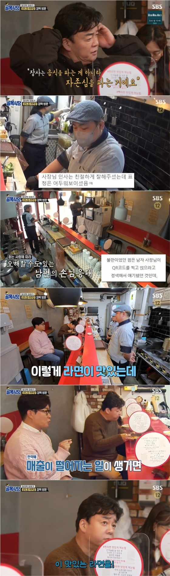 무거운 표정으로 가게에 들어선 백종원은 남자 사장의 응대를 보고 "왜 사람들이 SNS에 그런 글을 썼는지 알겠다"라면서 "장사는 음식을 파는 게 아니라 자존심을 파는 것"이라 조언했다.