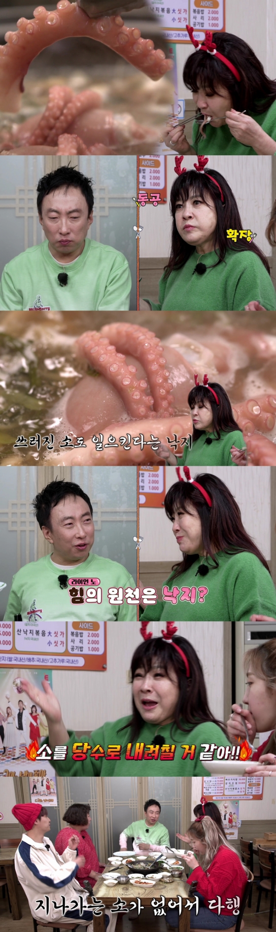 최근 녹화에서 노사연은 아귀탕 식당에 있는 산낙지 메뉴를 발견한 뒤 자비 없는 '먹방'을 예고했다. 낙지 탕탕이가 나오자 수저를 들고 시선을 떼지 못한 그는 한 번 맛을 보고는 "눈이 확 떠진다. 낙지는 쓰러진 소도 일으킨다고 하더라"며 흡족한 표정을 지었다.