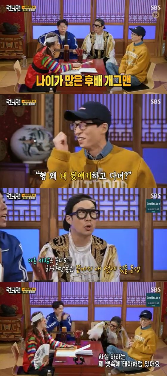 이날 '이마팍 도사'로 분한 전소민은 유재석에게 질투하는 주변인이 있다며, '나이가 많은 후배 개그맨'이라고 말했다. 이에 유재석은 "실제로 (박)명수 형은 제 뒷얘기를 몇번 하고 다녔다"고 밝혔다.