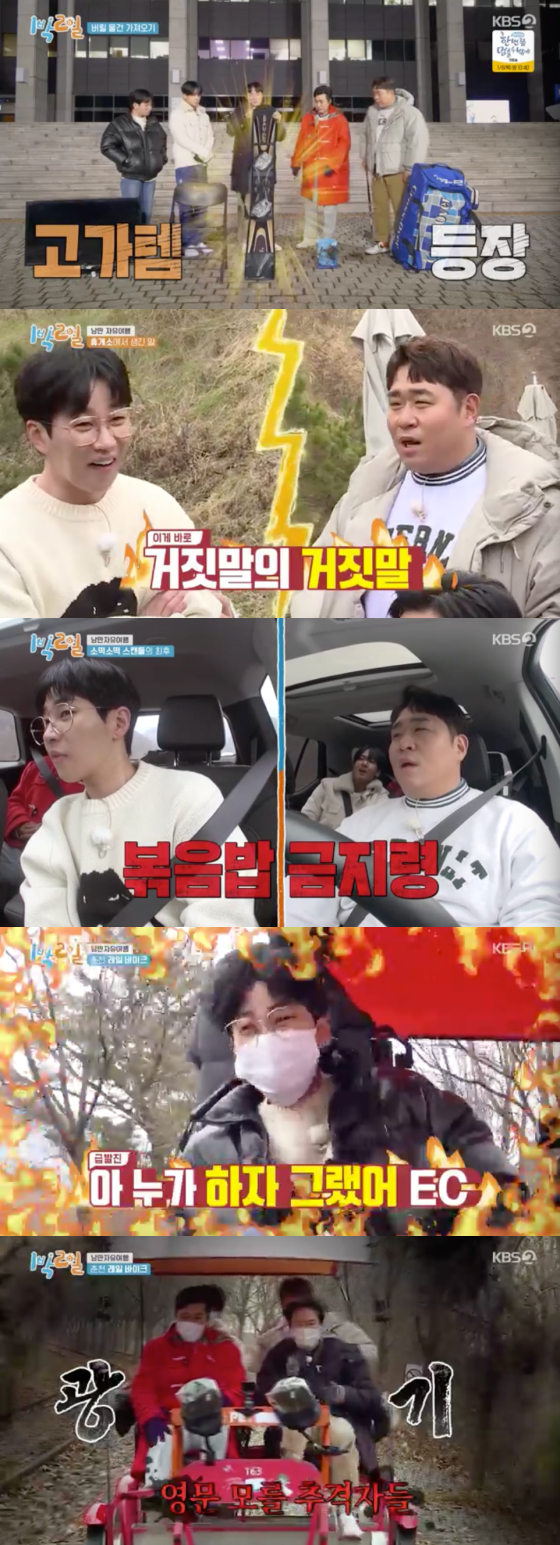 하지만 휴게소에서 간식을 사러 가는 길 딘딘과 문세윤은 간식을 몰래 빼먹으며 바로 배신을 시작했다. 문세윤은 멤버들이 속자 이후 두 차례나 더 거짓말을 해 충격을 더했다. 연정훈은 이에 딘딘과 문세윤에 점심 패널티로 '닭갈비 볶음밥 금지령'을 내려 환호를 자아냈다. 멤버들은 이어 레일 바이크를 타러 향했다. 4인 당 1대를 빌려야 한다는 말에 멤버들은 한 사람을 낙오시키기로 결정했고, 낙오된 딘딘은 촬영용 레일 바이크의 동력원으로 당첨돼 웃음을 안겼다.