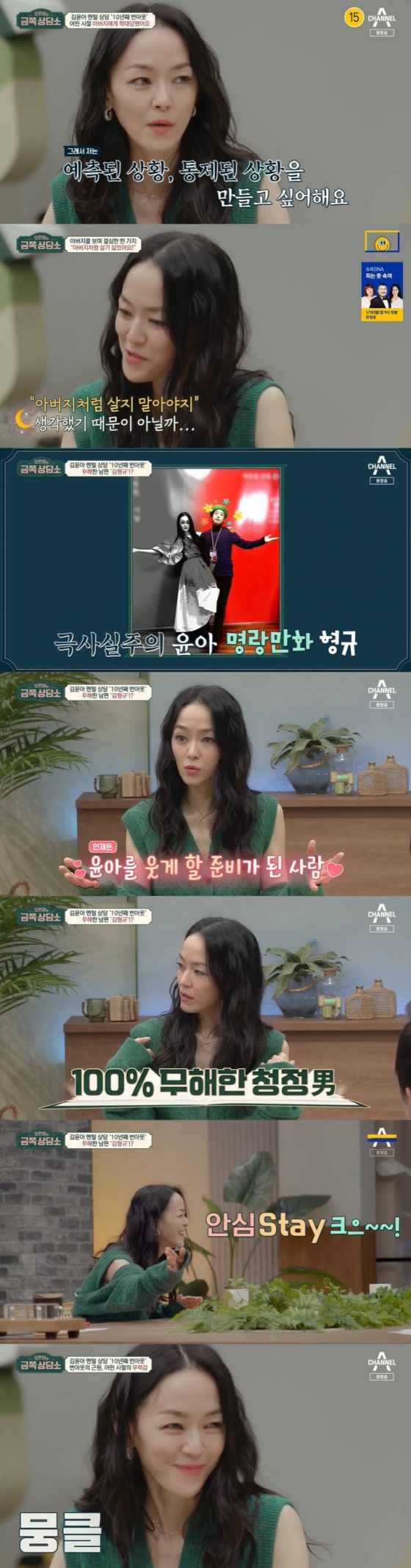 김윤아는 남편 김형규에 대해 "나는 극화채였는데 김형규 씨는 명랑만화채였다. 본질적으로 항상 웃길 준비가 돼 있어서 안심이 됐다"고 밝혔다. 오은영은 "김형규 손톱을 세우지 않는다"고 했고, 김윤아는 "(김형규가) 가부장적이지 않다. 무해하다고 느꼈다"며 "(김형규는) 연애할 때 다른 남자들과 달랐다. 나에게 안심 스테이크를 시켜주며 '안심해'라고 하더라"며 웃었다.
