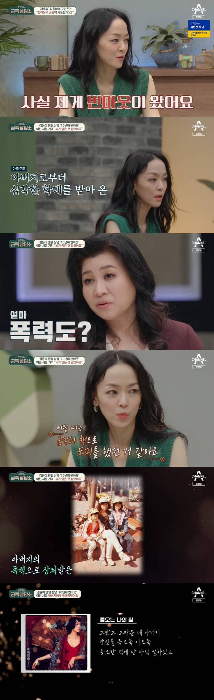 오은영은 김윤아에게 '초민감자'이기 때문이라고 진단했고, 김윤아는 "저희 집이 아이들에게 좋은 집이 아니었다. 폭력적인 아버지로부터 어머니와 나, 동생이 신체적, 정서적으로 학대를 받았다. 아버지가 목공소에 가서 매를 사이즈별로 맞췄다. 화나는 것 중에 하나가 아버지는 밖에서는 너무 좋은 가장처럼 했다는 것이다. 나는 대학생이 돼서도 통금 시간이 오후 8시였다. 항상 불안했고 초등학교 때는 내가 기억이 잘 안 난다. 뇌가 멍든 것처럼 멍했다"고 털어놨다. 이어 그는 "어릴 때는 '이 세상이 다 가짜야'라고 생각했다. 친구들과 재미있게 지내지도 못했고 어릴 때 음악과 책으로 도피했다"고 말했다.