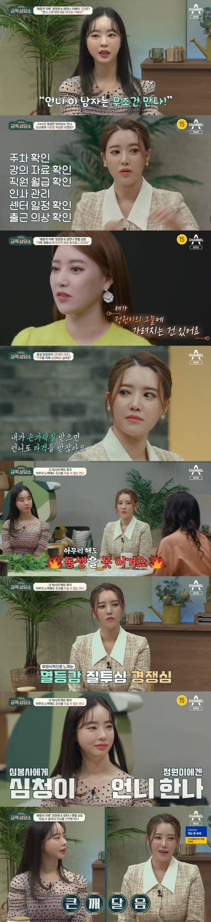 양정원은 "내가 하고 싶은 게 많다. 다른 사람의 간섭과 잔소리를 싫어한다"면서 양한나가 간섭하는 것에 대해 "특별히 생각해 본 적은 없다"고 말했다. 양한나는 "어릴 때부터 정원이가 엄청 예뻤다. 이 아이를 세상에 빛나게 해주고 싶다고 생각했다"고 했고, 오은영은 "언니가 엄마의 위치에 있다"고 분석했다.