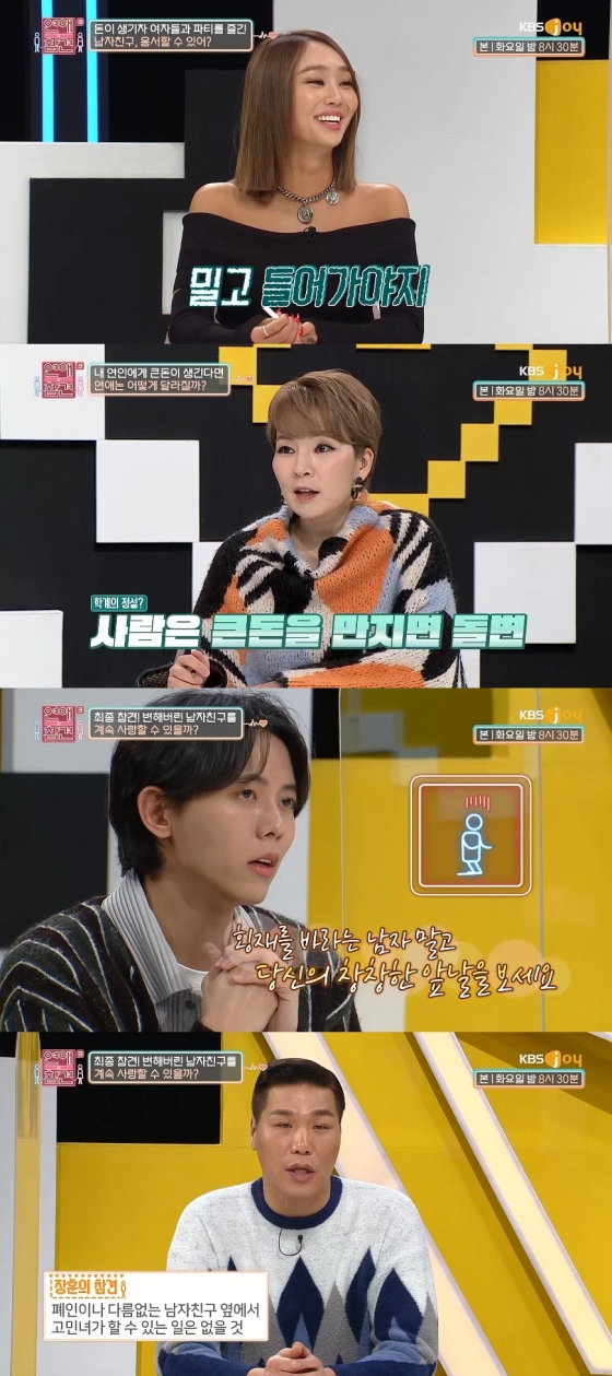 그러던 어느 날, 남자친구는 집과 차를 구하고 고민녀에게 신용카드까지 선물했다. 투자가 대박나 부자가 됐던 것이다. 하지만 그날부터 남자친구의 얼굴을 보는 것도 어려워졌다. 이에 고민녀는 남자친구의 집에 찾아갔는데, 남자친구는 클럽에서 만난 여자들과 파티를 즐기고 있었고 고민녀는 그 자리에서 나와 이별을 택했다.
