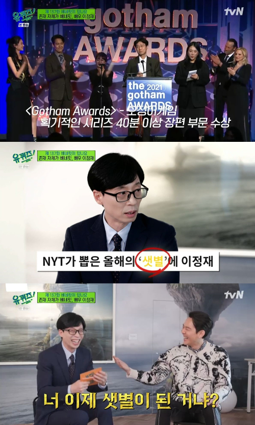 유재석은 "뉴욕타임스에서 올해의 샛별이라고 하더라"고 하자, 이정재는 "안 그래도 그 기사 나오고선 연락 참 많이 받았다 '너 이제 샛별이 된 거냐'고"라고 했다.