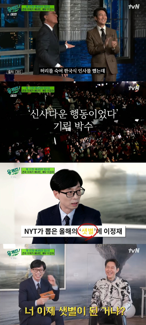 유재석은 "뉴욕타임스에서 올해의 샛별이라고 하더라"고 하자, 이정재는 "안 그래도 그 기사 나오고선 연락 참 많이 받았다 '너 이제 샛별이 된 거냐'고"라고 말하며 폭소케 했다.