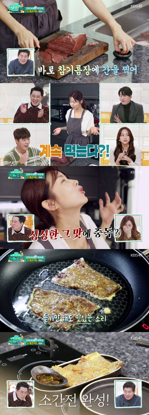 박솔미는 "아우 피 냄새"라며 먹방을 선보였다. 이에 붐은 "구미호가 확실하다. 그 어느 때보다 좋아하고 있다"라고 말했다. 솔미는 "간은 소간이야"며 "으음" 하면서 맛을 봤다. 이어 박솔미는 소간으로 전을 부쳤다. "너무 많이 구으면 퍽퍽해지니까 살짝만 해야한다"며 팁도 공개했다.