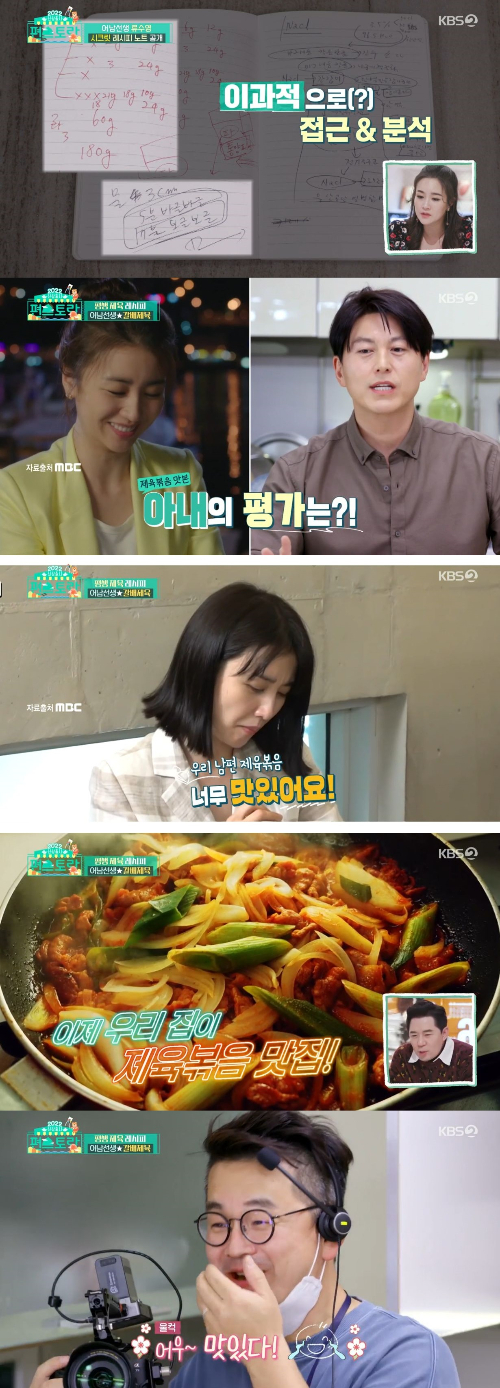 이어 류수영은 "아내 박하선과 3주 동안 제육만 먹었다"며 제육볶음 레시피를 오랜 시간 공들여 연구했다고 밝혔다. 류수영은 "박하선이 자신이 만든 제육볶음을 맛보더니 경지에 이르렀다더라"며 자랑했다. 출연진의 기대를 한가득 안고 류수영은 제육볶음을 선보였다. 류수영은 "식구들 입 크기에 따라 잘라라. 그리고 양념장을 만들면 된다. 고추장, 간장, 설탕. 기본적으로 이 세 개다"고 양념장을 소개했다. 류수영은 "필요한 건 돼지고기 앞다릿살이나 뒷다릿살로 해라"면서 "제일 중요한 건 핏물 제거다. 안 그러면 냄새가 날 수 있다"라고 덧붙였다.