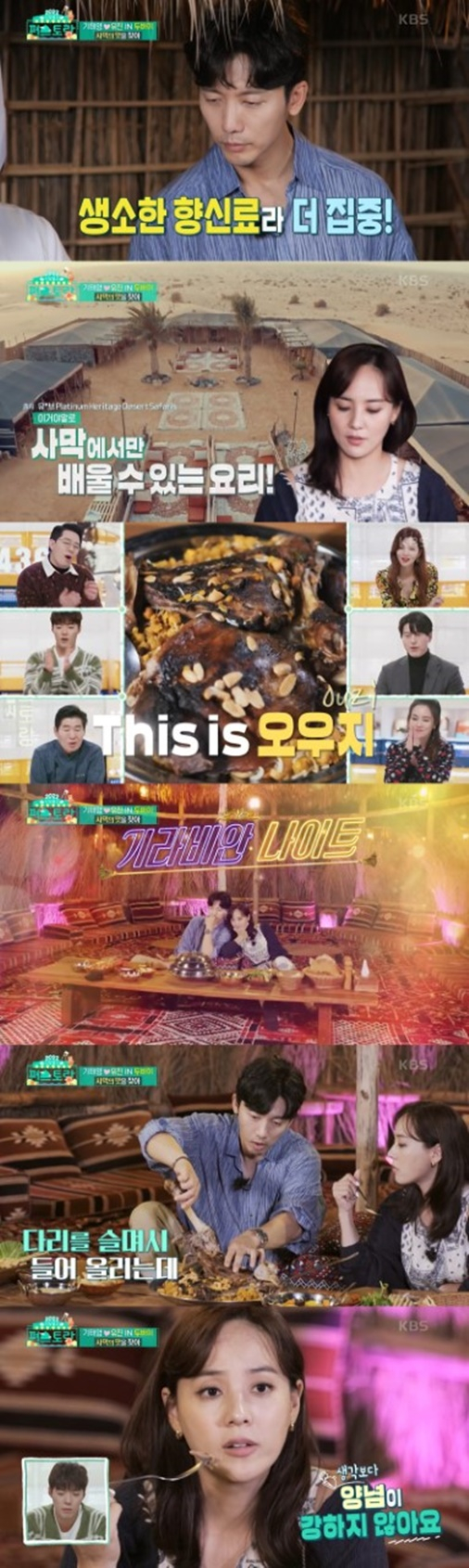 이날 방송에서 기태영 유진 부부는 두바이 사막 한가운데 위치한 전통 레스토랑을 찾았다. 오직 이곳에서만 맛볼 수 있는 두바이 전통 요리 '오우지'가 부부의 시선을 강탈했다. '오우지'는 신선한 양고기에 15종 이상의 향신료를 발라 오래 구운 것으로 깊은 풍미와 극강의 부드러움을 자랑한다.
