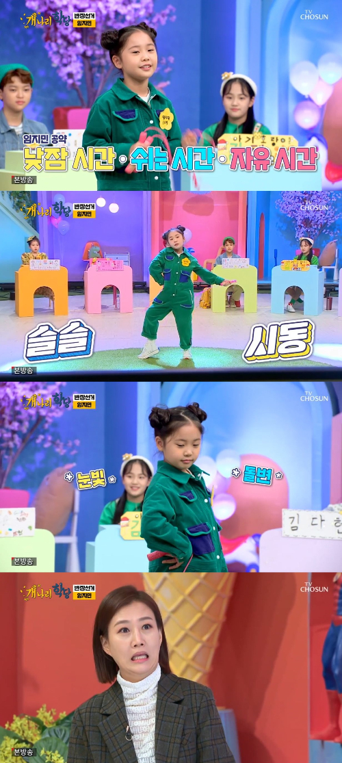 첫 번째 반장 후보로 임지민이 나섰다. 임지민은 공약으로 "쉬는 시간과 낮잠 시간인 휴식 시간을 제공하겠다"라고 밝혔다. 장기자랑으로 음악에 맞춰 줄넘기를 선보였다. 임지민의 현란한 발놀림에 장윤정은 놀라움을 감추지 못했다. 붐은 "지민이 진짜 잘한다"라며 칭찬하자, 임지민은 "2단 뛰기"라며 2단 뛰기를 가볍게 선보였다.